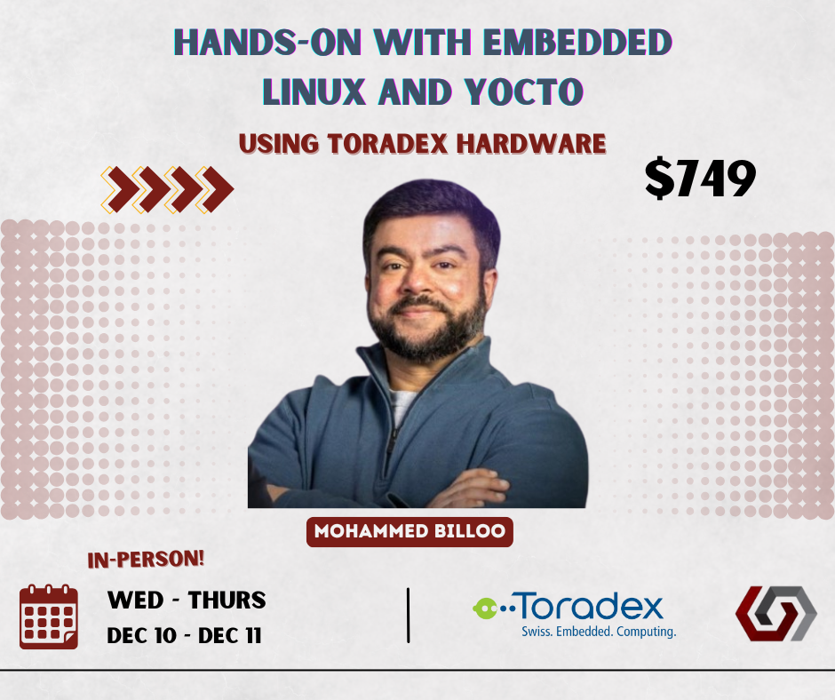 Looking to get hands-on experience with Embedded Linux and The Yocto Project/OpenEmbedded? In this in-person 2-day intensive course, participants will learn how to get started customizing Embedded Linux, developing a custom distribution with The Yocto Project/OpenEmbedded, and deploying it to commercial hardware.
